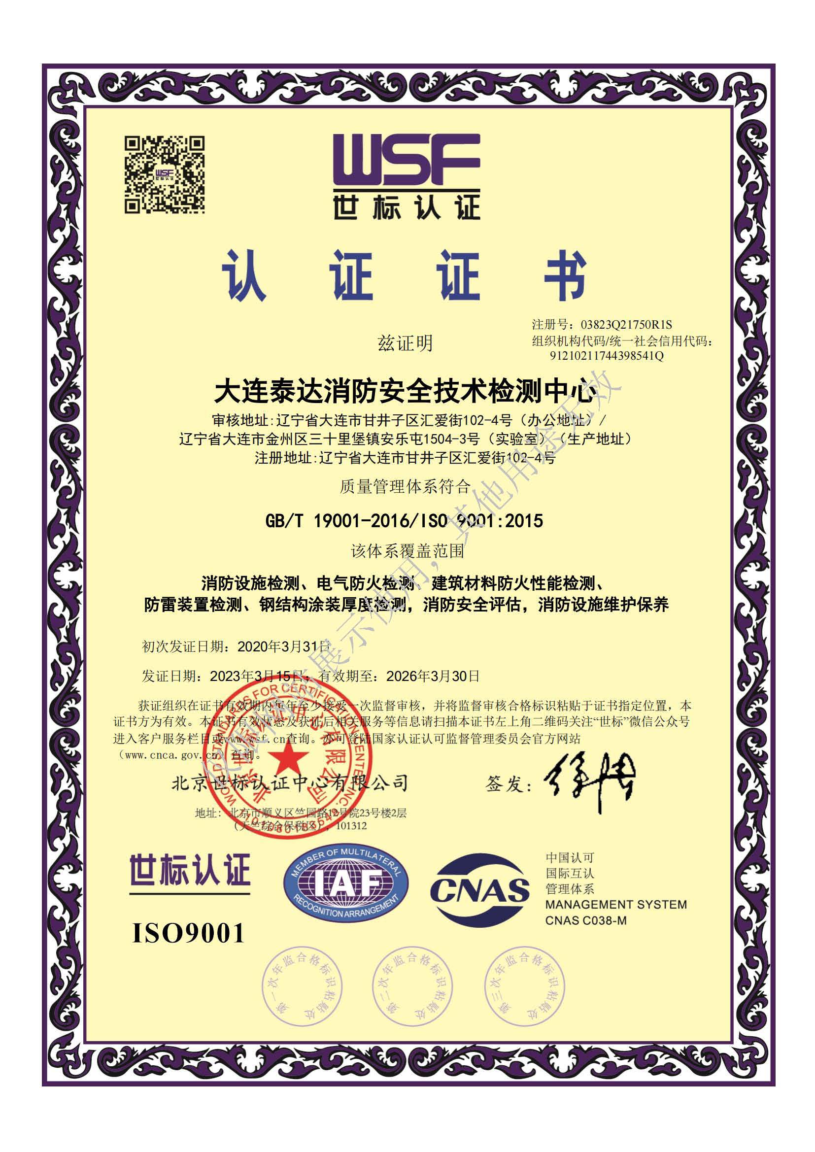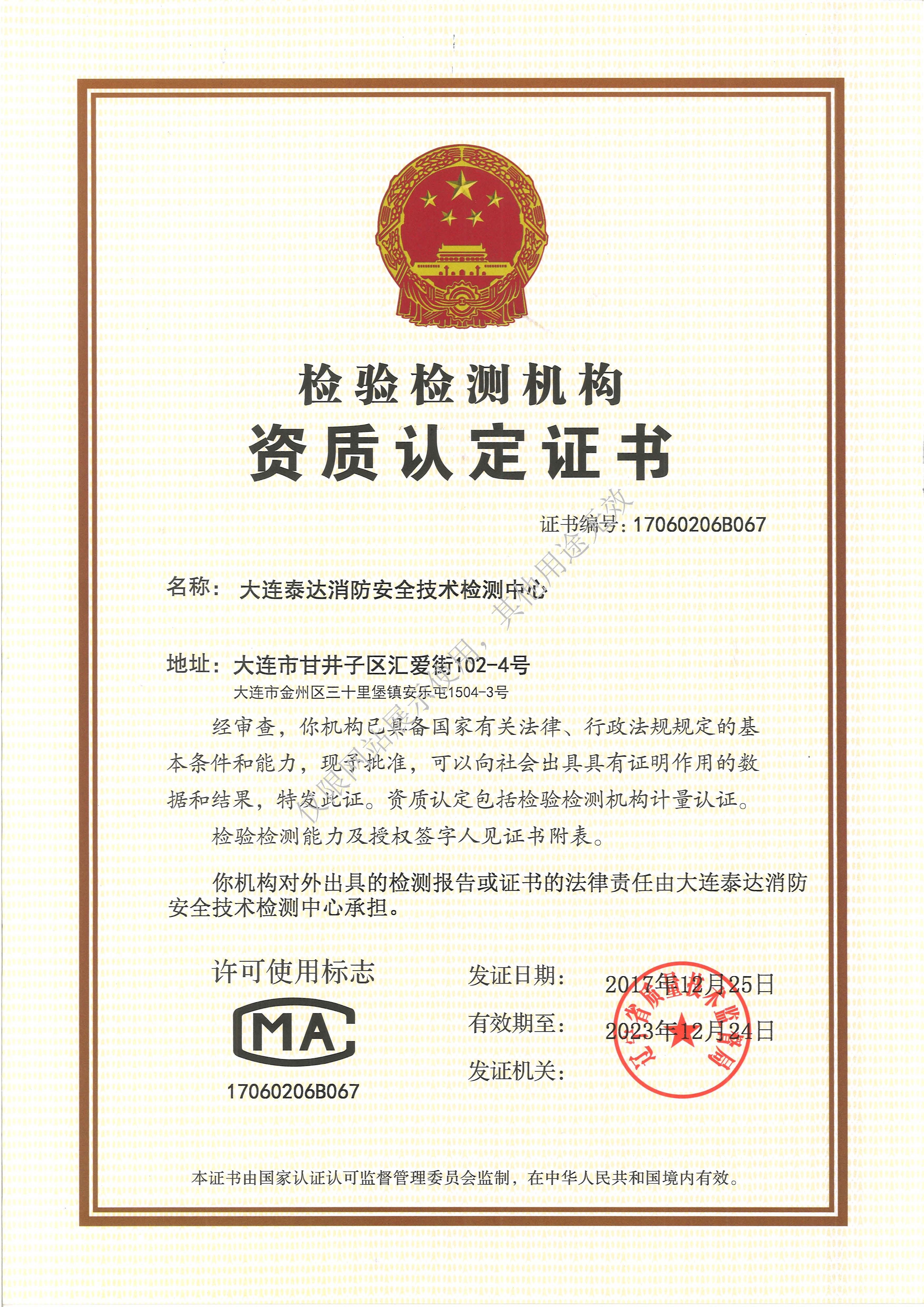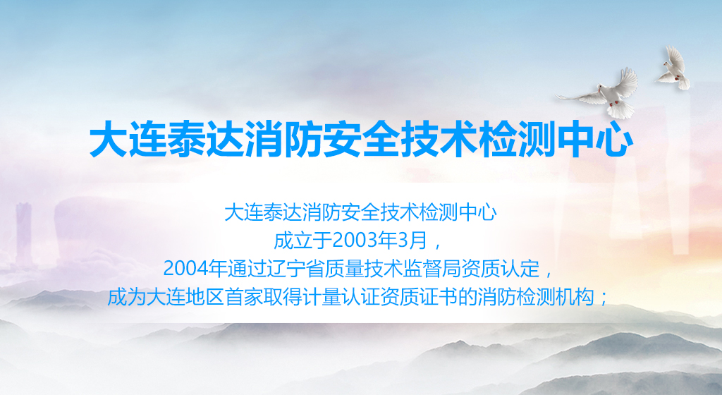 · 大連泰達消防安全技術檢測中心成立于2003年3月,是一家專注從事消防設施維護保養(yǎng)、消防設施檢測、電氣防火檢測、消防安全評估、雷電防護裝置檢測、防火涂料檢測、消防技術咨詢與消防培訓等專業消防技術服務的企業。